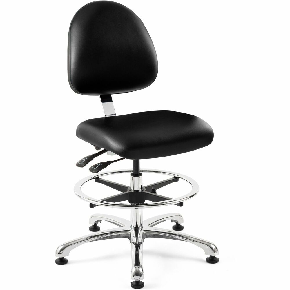 Integra ISO 7 Cleanroom Chair effectively meets the needs of various work environments, especially cleanrooms and healthcare settings. Antibacterial, anti-fungal vinyl meets ASTM G21 and AATCC TM147 standards for cleanliness and safety as well as CAL 117, FMVSS 302 and NFPA 260 standards. Pneumatic, articulating seat and back tilt adjustment allow you to work from an optimal position. Ergonomic seat adjusts in height from 21.5" to 31.5". Waterfall seat improves lower-body circulation and overall health. Fully contoured back provides added lumbar support and encourages proper spine alignment. Along the office chair's base cylinder, a threaded knob adjusts the 20" chrome foot ring's height from 7.5" to 17.5" Sturdy, five-legged aluminum base moves on mushroom glides and supports up to 300 lb. to ensure stability at any height. Seat size is 20" wide x 18" high. Back measures 17.5" wide x 16" high.