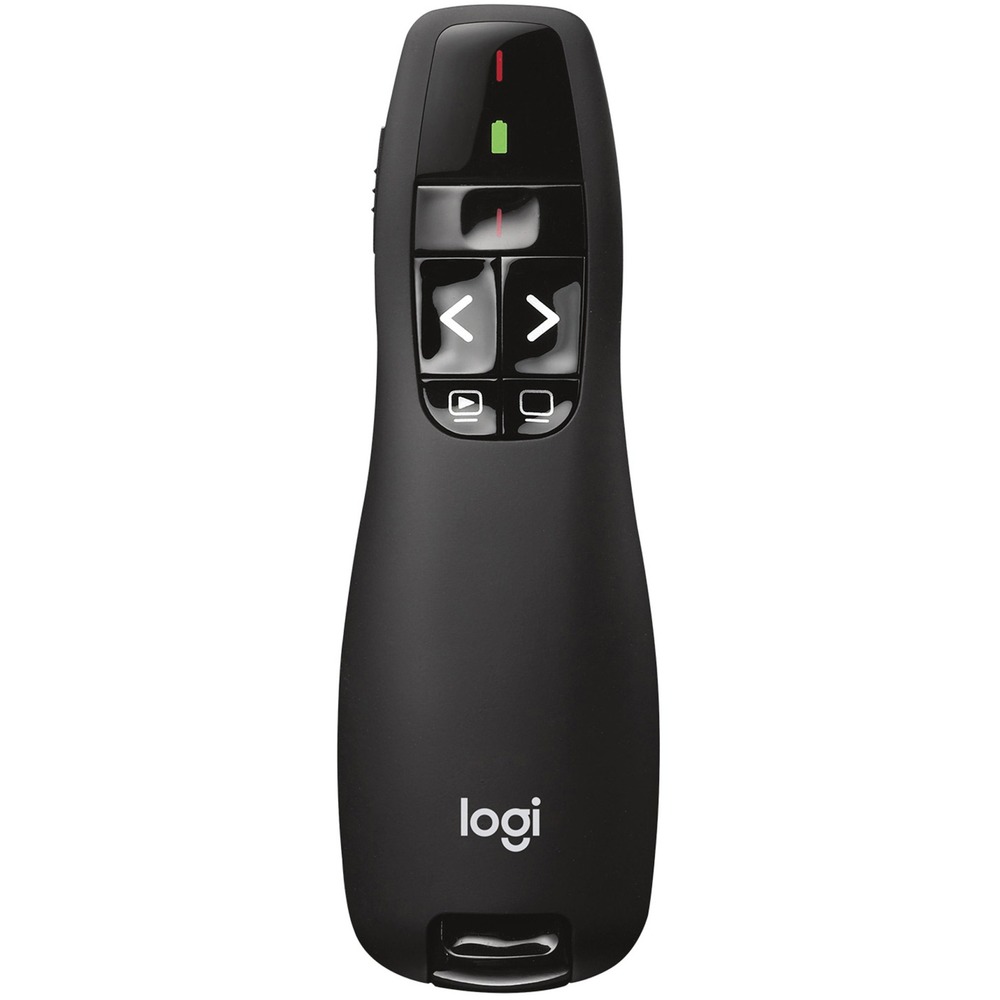 Logitech Wireless Presenter R400 is designed to help you make your point. Its intuitive slideshow controls help you navigate through your presentation with confidence. Buttons are easy to find by touch. And its shape feels great in your hand. It's got a red laser pointer that's easy to see against most backgrounds and a range of up to 50 feet (15 meters), so you've got the freedom to move around the room and mingle with your audience. A storable plug-and-play wireless receiver makes it simple to get started-there's no software to install. And when you're through, the receiver stores inside the presenter to make packing up easy.