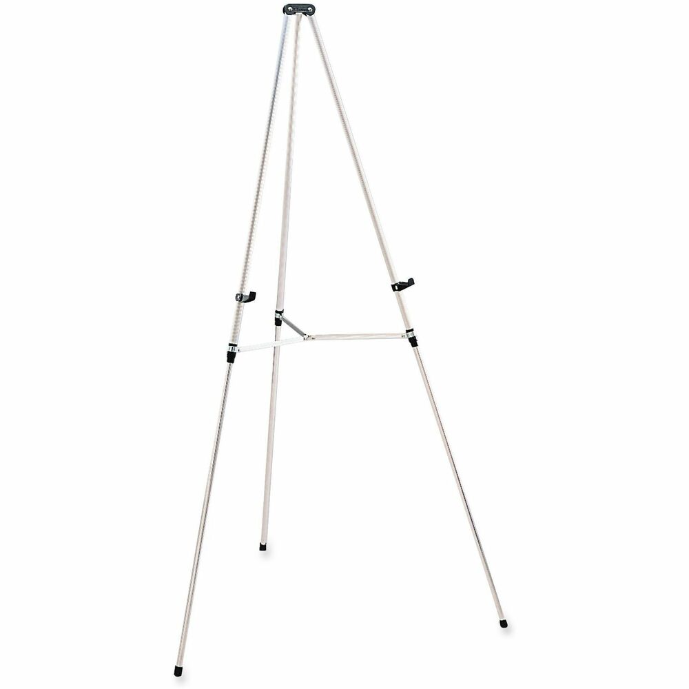 Aluminum telescoping display easel presents information at an optimal height to capture attention and maximize your message. Solid construction of the locking cross base reinforces the tripod design for added stability. 3/4" tubular legs adjust the easel in height from 35" to 64" and support up to 25 lb. of display weight. Secure a flip chart (not included) to the easel with the built-in pad retainer bar. Easel adjusts to support documents of varying sizes.